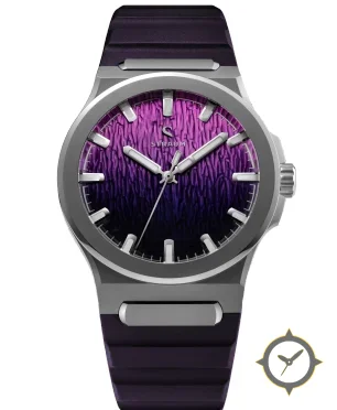 A Sports watch with a bold 43mm presence on the wrist, crafted from titanium featuring a purple dial with a unique raised, bark-like wavy texture finish and a true GMT complication for tracking a second time zone.