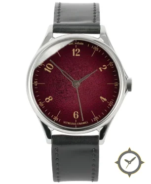 A Dress watch with a bold 44.5mm presence on the wrist, crafted from stainless steel featuring a crimson dial with a unique granular vitreous enamel (textured) finish.