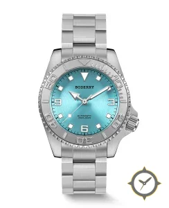 A Dive watch with a vintage-inspired 32.5mm case, crafted from stainless steel featuring a turquoise dial with a unique sunburst finish.