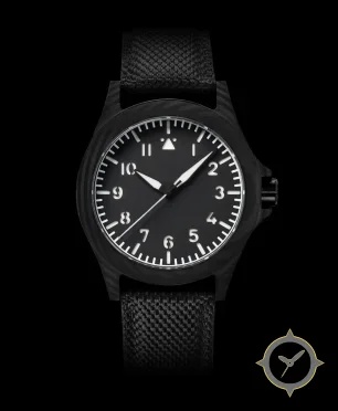 A Pilot watch with a versatile 39.5mm case, that suits most wrists, crafted from carbon featuring a black dial with a unique matte finish.