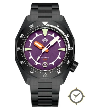 A Dive watch with a vintage-inspired 34mm case, crafted from stainless steel featuring a purple dial with a unique grained finish.