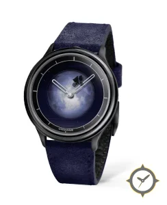 A Minimalist watch with a bold 44mm presence on the wrist, crafted from stainless steel featuring a navy dial with a unique printed moon motif with subtle gradient finish.