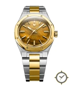 A Luxury watch with a vintage-inspired 37.5mm case, crafted from stainless steel featuring a brown dial with a unique tiger's-eye / sunburst sheen finish.