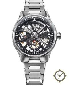 A Skeleton watch with a vintage-inspired 36.5mm case, crafted from stainless steel featuring a black dial with a unique open-worked / skeletonized, visible movement and gears finish.
