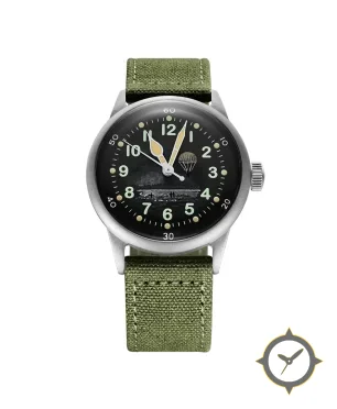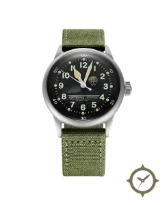 A Military watch with a versatile 40.5mm case, that suits most wrists, crafted from stainless steel featuring a black dial with a unique glossy lacquer with printed illustration finish.