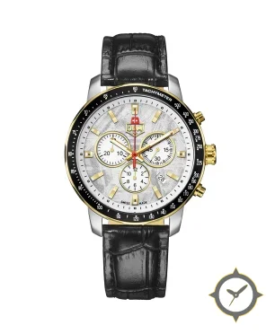 A Chronograph watch with a bold 50mm presence on the wrist, crafted from stainless steel featuring a silver dial with a unique textured (meteorite-like) finish.