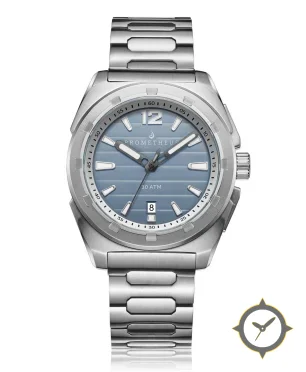A Sports watch with a bold 50mm presence on the wrist, crafted from stainless steel featuring a blue dial with a unique horizontal ribbed finish.