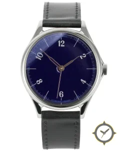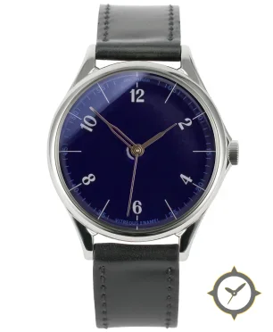 A Dress watch with a vintage-inspired 35.5mm case, crafted from stainless steel featuring a navy dial with a unique vitreous enamel (glossy) finish.