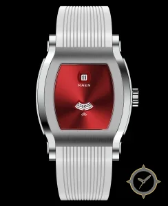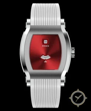 A Luxury watch with a vintage-inspired 35mm case, crafted from stainless steel featuring a red dial with a unique sunburst finish.