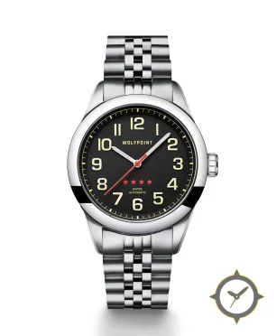 A Field watch with a bold 46mm presence on the wrist, crafted from stainless steel featuring a black dial with a unique matte finish.