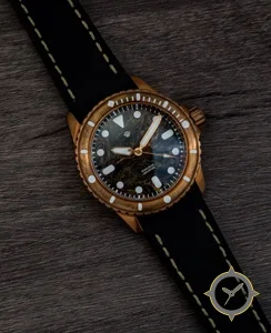 A Dive watch with a bold 48mm presence on the wrist, crafted from bronze featuring a black dial with a unique marbled finish.