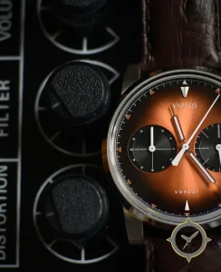A Chronograph watch with a vintage-inspired 36mm case, crafted from stainless steel featuring a brown dial with a unique sunburst finish.