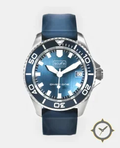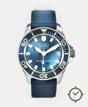A Dive watch with a vintage-inspired 37mm case, crafted from stainless steel featuring a blue dial with a unique sunburst finish.