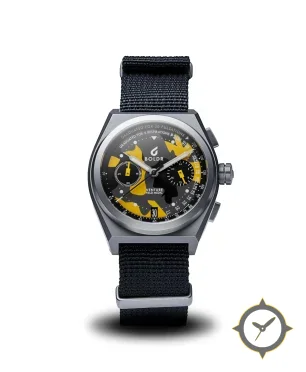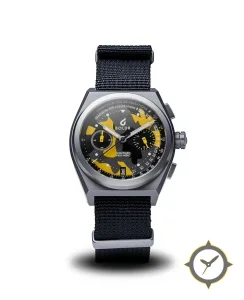 A Chronograph watch with a versatile 39mm case, that suits most wrists, crafted from titanium featuring a black dial with a unique matte camouflage finish.