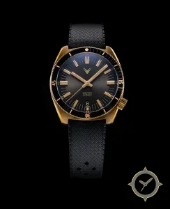A Dive watch with a vintage-inspired 36.5mm case, crafted from bronze featuring a black dial with a unique sunburst finish.