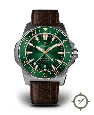 A GMT watch with a bold 42.5mm presence on the wrist, crafted from stainless steel featuring a green dial with a unique sunburst finish and a true GMT complication for tracking a second time zone.