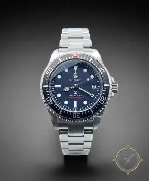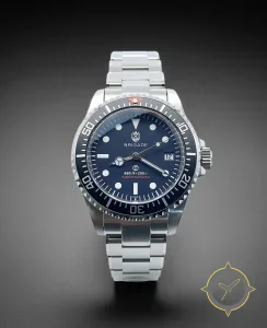 A Dive watch with a vintage-inspired 34.5mm case, crafted from stainless steel featuring a blue dial with a unique matte with slight sunburst finish.