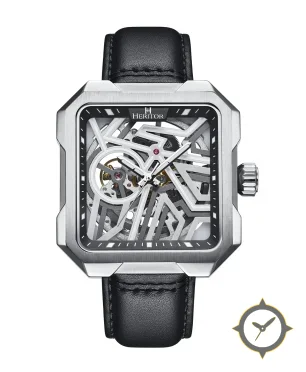 A Skeleton watch with a bold 42.5mm presence on the wrist, crafted from stainless steel featuring a silver dial with a unique skeletonized / open-worked finish.