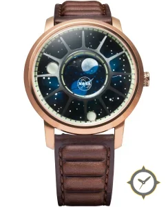 A Luxury watch with a vintage-inspired 37.5mm case, crafted from gold featuring a navy dial with a unique glossy finish and a beautiful moonphase display.