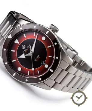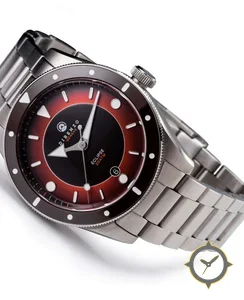 A Dive watch with a bold 44mm presence on the wrist, crafted from stainless steel featuring a red dial with a unique sunburst gradient finish.