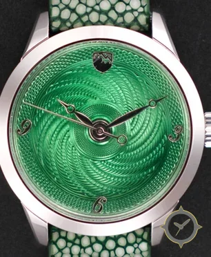 A Dress watch with a bold 44.5mm presence on the wrist, crafted from stainless steel featuring a green dial with a unique guilloché (engine-turned) finish.