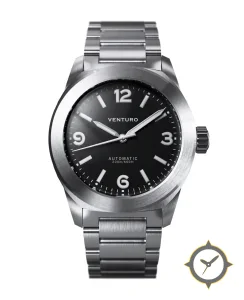 A Field watch with a vintage-inspired 36mm case, crafted from stainless steel featuring a black dial with a unique matte finish.