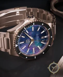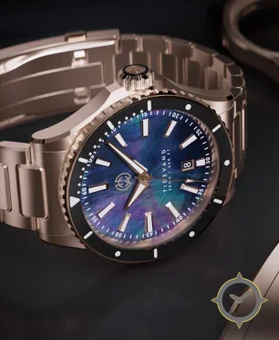 A Dive watch with a vintage-inspired 36mm case, crafted from gold featuring a blue dial with a unique mother-of-pearl (iridescent) finish.