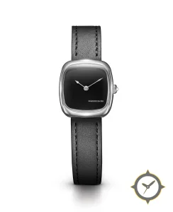 A Dress watch with a vintage-inspired 23.5mm case, crafted from stainless steel featuring a black dial with a unique glossy lacquer finish.