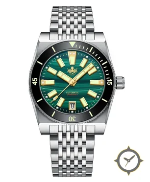 A Dive watch with a vintage-inspired 36.5mm case, crafted from stainless steel featuring a green dial with a unique banded/malachite-like horizontal striations finish.