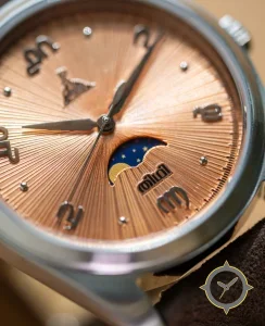 A Dress watch with a vintage-inspired 33.5mm case, crafted from stainless steel featuring a gold dial with a unique sunburst (radiating guilloché) finish and a beautiful moonphase display.