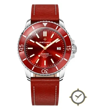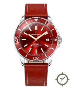 A Dive watch with a bold 50mm presence on the wrist, crafted from stainless steel featuring a red dial with a unique sunburst finish.