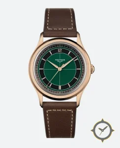 A Dress watch with a bold 41.5mm presence on the wrist, crafted from gold featuring a green dial with a unique matte center with contrasting outer ring (sector-style) finish.