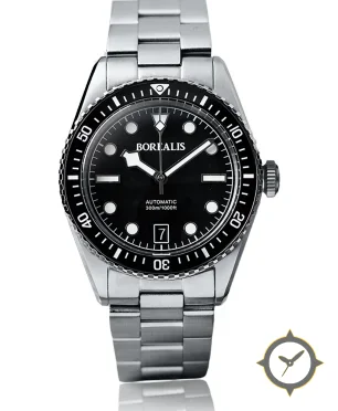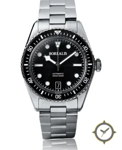 A Dive watch with a vintage-inspired 35mm case, crafted from stainless steel featuring a black dial with a unique matte finish.