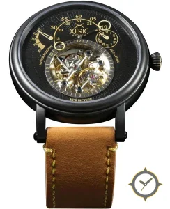 A Skeleton watch, crafted from stainless steel featuring a black dial with a unique brushed radial / textured ring finish and a helpful power reserve indicator.
