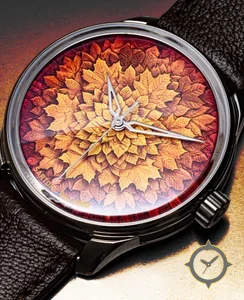 A Dress watch with a bold 42.5mm presence on the wrist, crafted from stainless steel featuring a orange dial with a unique cloisonné/enamel with engraved relief (textured leaf motif) finish.
