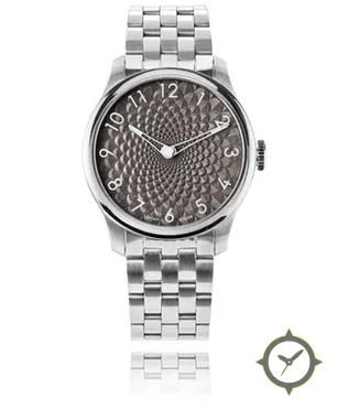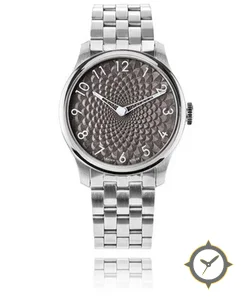 A Dress watch with a vintage-inspired 34.5mm case, crafted from stainless steel featuring a brown dial with a unique engine-turned (guilloché) finish.