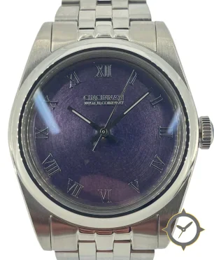 A Dress watch with a vintage-inspired 34.5mm case, crafted from stainless steel featuring a purple dial with a unique sunburst (radial brushed) finish.