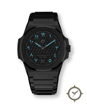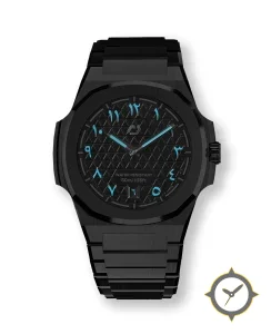 A Luxury watch with a versatile 39.5mm case, that suits most wrists, crafted from stainless steel featuring a black dial with a unique triangular geometric embossing (repeat pyramid/guilloché) finish.