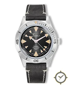 A Dive watch with a vintage-inspired 30.5mm case, crafted from stainless steel featuring a black dial with a unique sunburst finish.