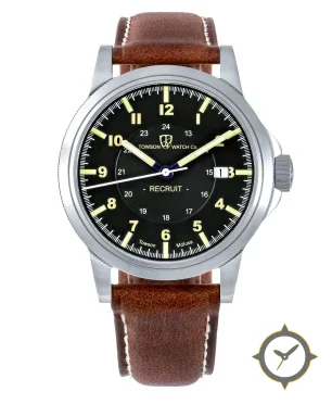 A Field watch with a vintage-inspired 35mm case, crafted from stainless steel featuring a black dial with a unique matte finish.