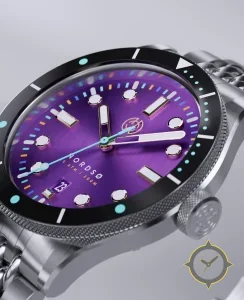 A Dive watch with a bold 41.5mm presence on the wrist, crafted from stainless steel featuring a purple dial with a unique sunburst finish.