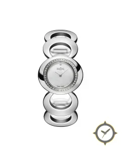 A Dress watch with a vintage-inspired 24.5mm case, crafted from stainless steel featuring a white dial with a unique mother-of-pearl finish.
