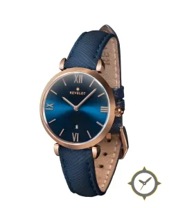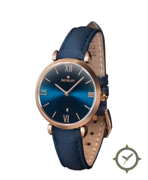 A Dress watch with a vintage-inspired 33.5mm case, crafted from gold featuring a blue dial with a unique sunburst/radial brushed finish.