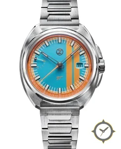 A Sports watch with a vintage-inspired 35mm case, crafted from stainless steel featuring a turquoise dial with a unique matte finish and a helpful power reserve indicator.