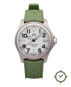 A Field watch with a bold 45.5mm presence on the wrist, crafted from titanium featuring a white dial with a unique matte finish.