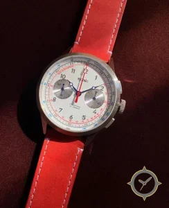 A Chronograph watch with a vintage-inspired 34mm case, crafted from stainless steel featuring a white dial with a unique matte finish.
