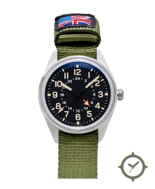 A Field watch with a vintage-inspired 32.5mm case, crafted from stainless steel featuring a black dial with a unique matte finish.