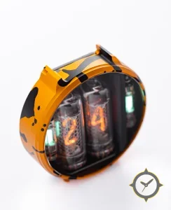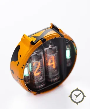 A Digital watch with a bold 58mm presence on the wrist, crafted from Coating featuring a black dial with a unique glass window revealing illuminated nixie tubes finish.