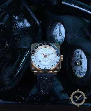 A Dive watch, crafted from bronze featuring a white dial with a unique lacquer finish and a true GMT complication for tracking a second time zone.