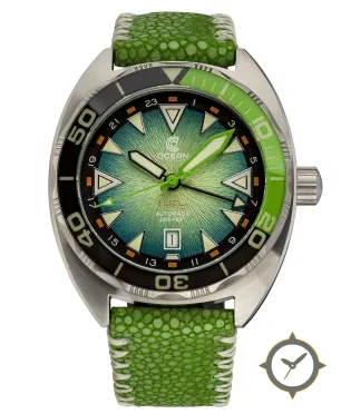 A Dive watch with a bold 45.5mm presence on the wrist, crafted from stainless steel featuring a green dial with a unique sunburst / radiant gradient finish and a true GMT complication for tracking a second time zone.